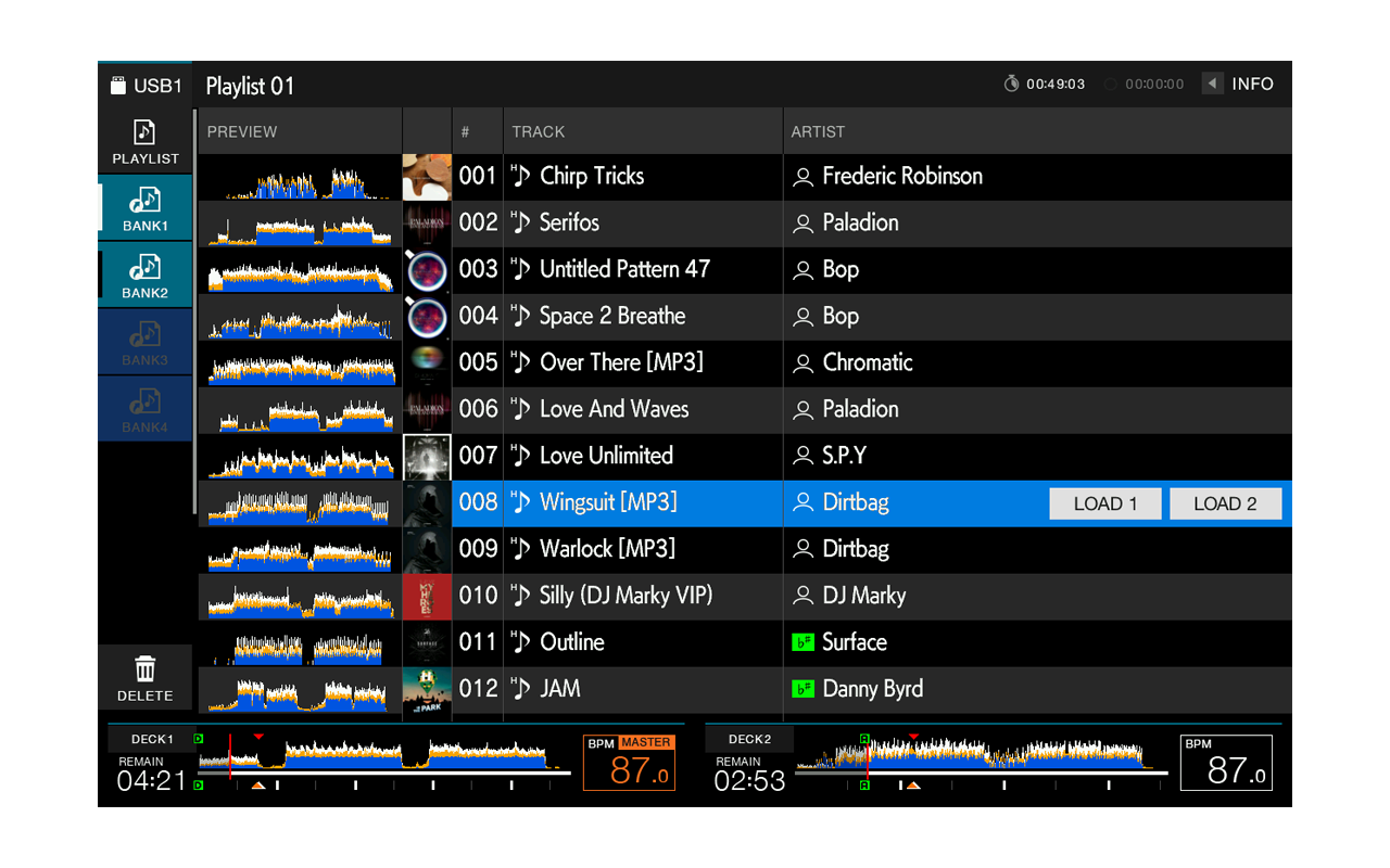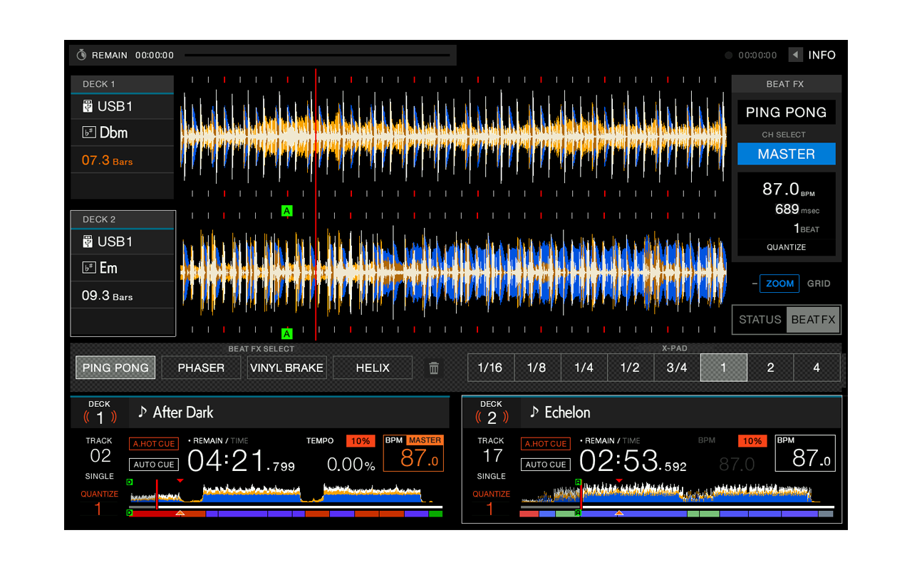 Der 10,1-Zoll-Touchscreen (25,7 cm) ist der größte, den es jemals bei einem Pioneer DJ-All-in-One-System gab. Es verfügt über eine hohe Auflösung und Bildrate, sodass du alles klar, deutlich und schön glatt siehst – auch die Wellenform. Darüber hinaus sorgen ein frisches GUI-Design und eine Vielzahl neuer Funktionen für eine einfachere Navigation, schnelles Browsen und präzises Mixen. Du kannst zum Beispiel einen der Iconstapel auf der linken Seite des Bildschirms berühren, um sofort die relevanten Informationen für jeden Track anzuzeigen.